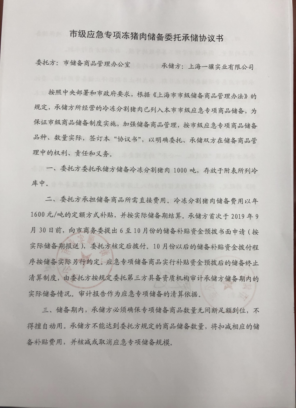2018年因非洲猪瘟疫情影响导致国内生猪产量骤减,响应上海市政府号召,急国家所急,上海一骥成为上海市政府应急储备单位,自2018年起每年为上海人民承储进口猪肉,尽自己绵薄之力。2023年伊始,上海一骥正式从应急储备单位提升为上海市长期储备单位,时刻准备着为老百姓、为国家做出应尽的责任与贡献。